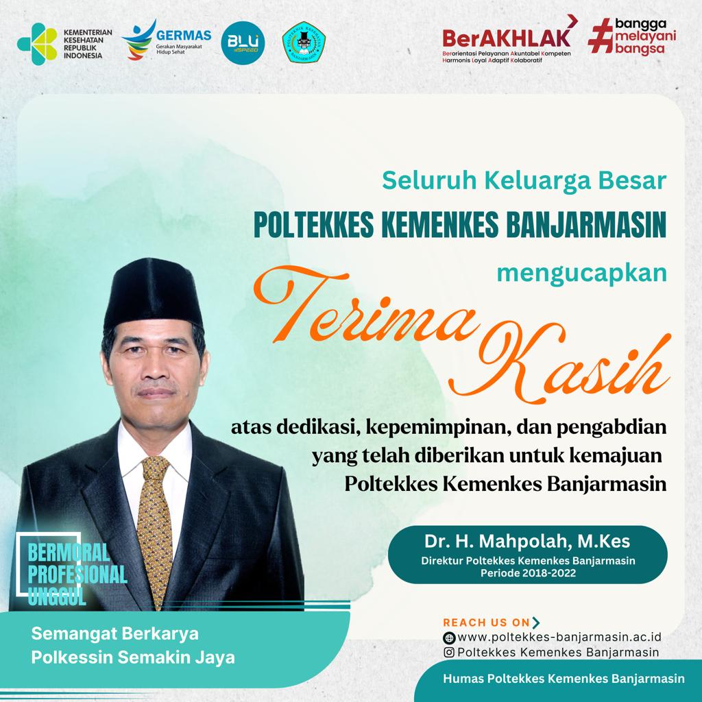 Keluarga besar Poltekkes Kemenkes Banjarmasin mengucapkan terima kasih dan apresiasi setinggi-tingginya kepada Dr. H. Mahpolah, M.Kes selaku Direktur Poltekkes Kemenkes Banjarmasin periode 2018-2022 atas dedikasi, kepemimpinan, dan pengabdian yang telah diberikan.Dengan penuh komitmen dan dedikasi yang tinggi Dr. H. Mahpolah, M.Kes telah memimpin Poltekkes Kemenkes Banjarmasin selama 2 periode berturut-turut. Dalam kepemimpinannya, banyak prestasi dan pencapaian kesuksesan yang telah diperoleh dalam mengembangkan institusi pendidikan kesehatan ini. Semua upaya ini dijalankan demi meningkatkan kualitas pendidikan dan pelayanan kesehatan yang diberikan, serta membantu masyarakat dalam mencapai kesehatan yang optimal. Kepemimpinan beliau telah menjadi inspirasi bagi seluruh dosen, staf, dan mahasiswa untuk terus berusaha memberikan yang terbaik bagi institusi dan masyarakat.