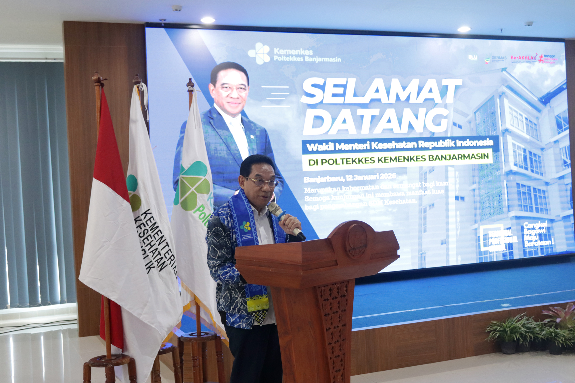 Kedatangan Wakil Menteri Kesehatan disambut langsung oleh Plt. Direktur Poltekkes Kemenkes Banjarmasin, Dr. Junaidi, SKM., MS, bersama dosen dan mahasiswa. Turut hadir Kepala Dinas Kesehatan Provinsi Kalimantan Selatan dr. Diauddin, M.Kes, Kepala BBLKM Banjarbaru Budi Santoso, S.KM., MPH, Plt. BKK Kelas I Banjarmasin M. Rasyid Ridha, SKM., MKL, Kepala LAPFK Banjarbaru Yuni Irmawati, SKM., MA, Anggota DPRD Provinsi Kalimantan Selatan Nur Fajri SE serta unsur pimpinan Poltekkes Kemenkes Banjarmasin yang meliputi para Wakil Direktur, Kepala Subbagian, dan Kepala Pusat.