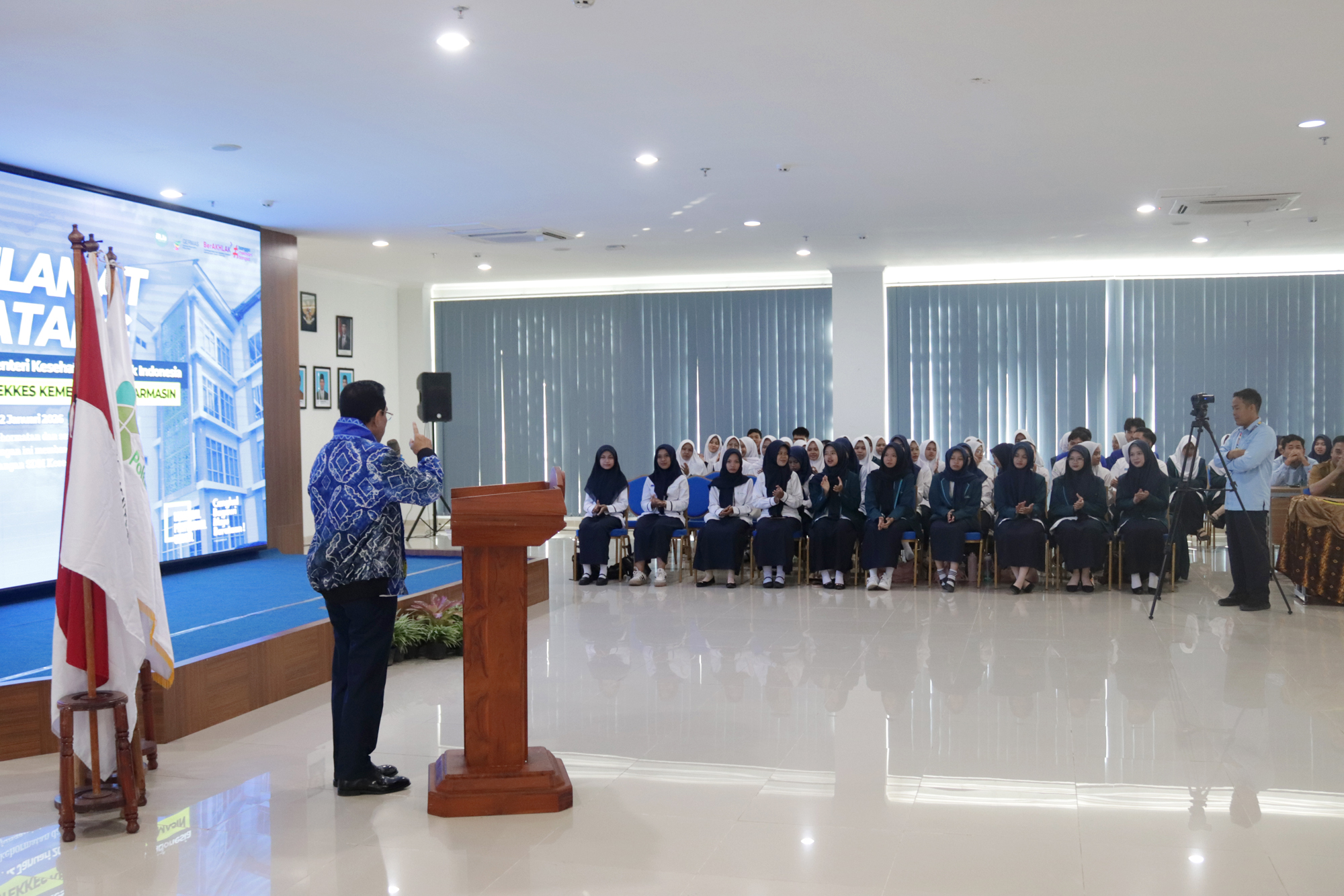 Kegiatan diawali dengan sambutan Plt. Direktur Poltekkes Kemenkes Banjarmasin yang menyampaikan gambaran peran dan komitmen institusi dalam mendukung pembangunan kesehatan nasional. Acara kemudian dilanjutkan dengan arahan Wakil Menteri Kesehatan serta sesi tanya jawab bersama mahasiswa dan perwakilan instansi terkait. Seluruh rangkaian kegiatan berlangsung dalam suasana santai, dialogis, dan penuh kekeluargaan.