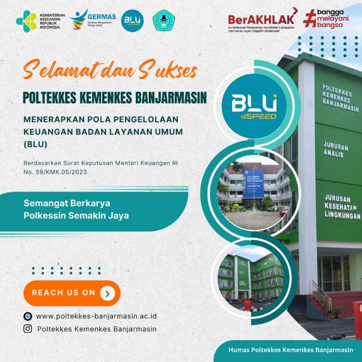 Berdasarkan Surat Keputusan Menteri Keuangan No. 59/KMK.05/2023 tentang Penetapan Politeknik Kesehatan Jambi, Politeknik Kesehatan Palangka Raya, Politeknik Kesehatan Palembang dan Politeknik Kesehatan Banjarmasin pada Kementerian Kesehatan sebagai Instansi Pemerintah yang Menerapkan Pola Pengelolaan Keuangan Badan Layanan Umum (BLU) pada tanggal 22 Februari 2023, maka Poltekkes Kemenkes Banjarmasin (Polkessin) telah resmi menjadi Satker BLU.